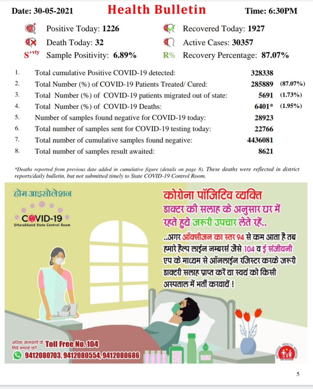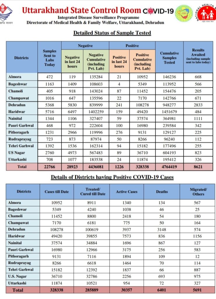 देहरादून – प्रदेश में कोरोना संक्रमण अब लगातार घटता हुए दिख रहा है, प्रदेश में लगे कर्फ्यू के बाद से आंकड़ों में काफी कमी आई है। पिछले 24 घंटे में 1226 मरीज़ मिले हैं, जबकि 32 लोगों ने जान गवाई है। वहीं 1927 लोग कोरोना से जंग जीते हैं। देखिये प्रदेश की स्थिति ..