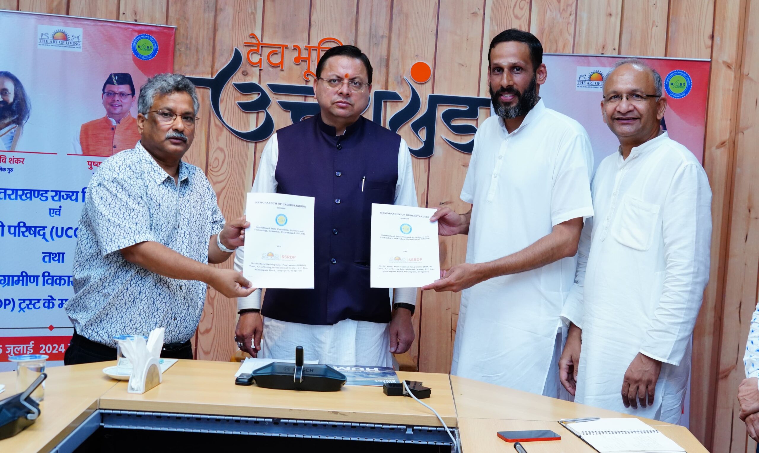 देहरादून – प्रदेश के ग्रामीण स्कूलों में 04 किलोवॉट के सोलर पैनल एवं मॉर्डन क्लास रूमों का निर्माण श्री श्री ग्रामीण विकास परिजनों ट्रस्ट (SSRDP) द्वारा किया जाएगा। इस संबंध में शुक्रवार को सांय मुख्यमंत्री आवास में मुख्यमंत्री श्री पुष्कर सिंह धामी की उपस्थिति में युकॉस्ट के महानिदेशक प्रो. दुर्गेश पंत तथा ऑर्ट ऑफ लिविंग एवं SSRDP के प्रतिनिधि श्री दीपक शर्मा के मध्य एमओयू हस्ताक्षरित किया गया।