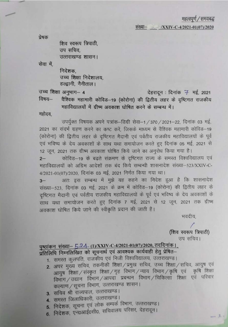 आदेश में लिखा गया है कि 7 मई से लेकर 12 जून तक उत्तराखंड में सभी निजी सरकारी और प्राइवेट कॉलेजों में ग्रीष्मकालीन अवकाश जारी रहेगा।