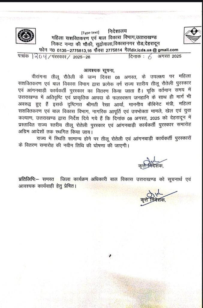 कैबिनेट मंत्री रेखा आर्या ने बताया कि प्रदेश की वीर नारियों को सम्मानित करने के लिए तीलू रौतेली पुरस्कार दिया जाता है, लेकिन इस साल अभी प्रदेश में प्राकृतिक आपदा के चलते जनहानि हुई है और हालात सामान्य नहीं है। इस कारण इस पुरस्कार की विजेता को सम्मानित करना अभी संभव नहीं हो पाएगा। इसके अलावा आंगनबाड़ी कार्यकर्ती पुरस्कार का वितरण भी अभी स्थगित कर दिया गया है। इन दोनों पुरस्कारों का वितरण 8 अगस्त को देहरादून में आयोजित होने वाले समारोह में किया जाना था।