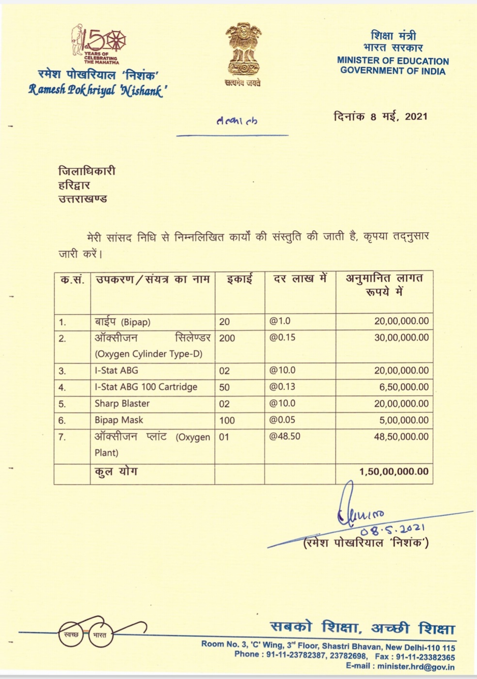 हरिद्वार – हरिद्वार से सांसद व केंद्रीय शिक्षा मंत्री रमेश पोखरियाल निशंक ने अपने सांसद निधि से 1.50 करोड़ रुपये अपने संसदीय क्षेत्र में कोरोना से लड़ने के लिए दिए हैं। कोरोना मरीज़ों के इलाज़ में आने संसाधनों के लिए इस राशि को उपयोग में लाने के लिए निशंक ने हरिद्वार जिला अधिकारी को पत्र लिखा है।
