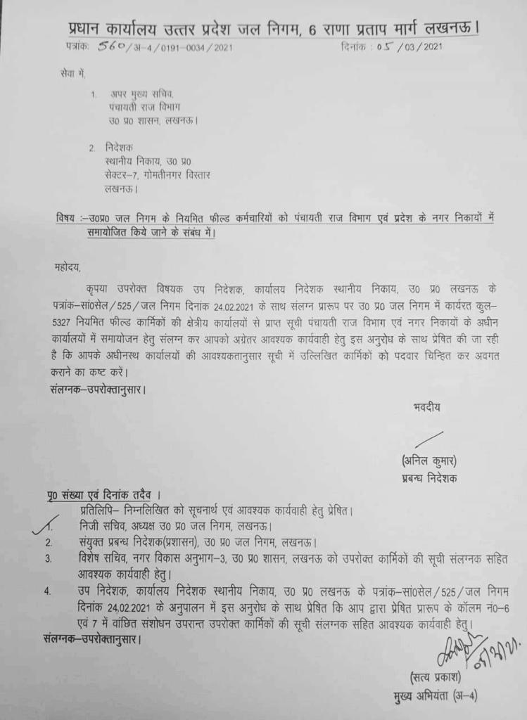 जल निगम को समाप्त करके जल निगम के 5 हजार से ज्यादा कर्मचारियों का मर्जर दूसरे विभागों में होगा। पंचायतीराज और स्थानीय निकाय में समायोजन की योजना है। जल निगम यूपी का सबसे पुराना कॉर्पोरेशन है। प्रक्रिया के तहत प्रबंध निदेशक ने औपचारिक पत्र भेजा