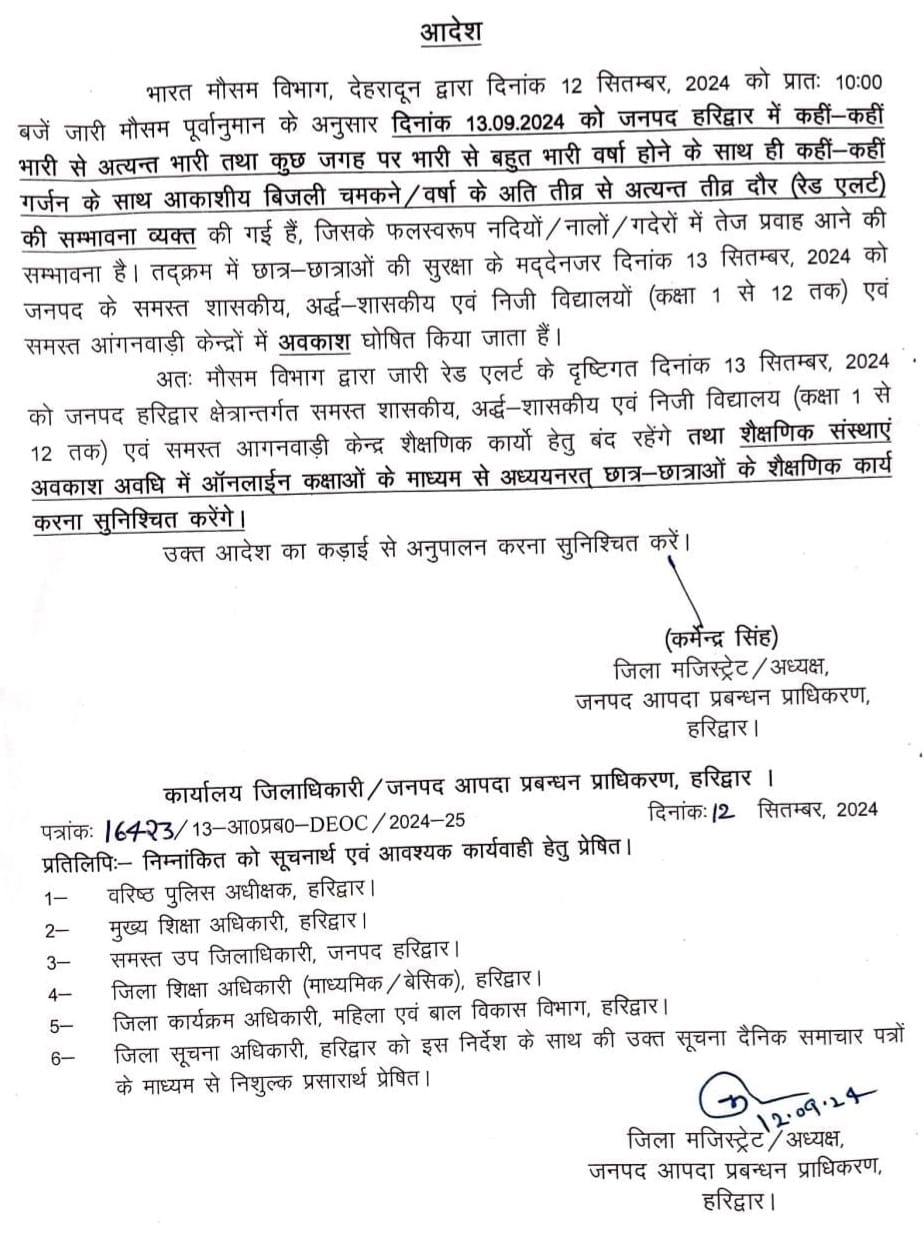 हरिद्वार – मौसम विभाग के पूर्वानुमान को देखते हुए 13 सितंबर को हरिद्वार में कक्षा 1 से 12वीं तक के सभी स्कूलों को बंद रखने का आदेश जारी किया गया है। मौसम विभाग के भारी बारिश के अलर्ट को देखते हुए स्कूलों में छुट्टी घोषित हुई है।
