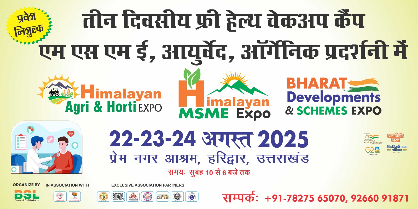 हरिद्वार – आज की दौड़भाग वाली जीवन शैली में जैविक उत्पादों की महत्ता को ध्यान में रखते हुए बीएसएल की ओर से 22, 23 ओर 24 अगस्त को प्रेम नगर आश्रम में भारत डेवलपमेंट एंड स्कीम एक्सपो, एग्री एंड होर्टी एक्सपो, हिमालय एमएसएमई एक्सपो का आयोजन किया जा रहा है। जिसमें देश की 180 कंपनियों के साथ भारत सरकार एवं उत्तराखंड सरकार के विभाग भी भाग ले रहे है। प्रदर्शनी में कृषि, बागवानी से संबंधित जानकारी के साथ सरकारी विभागों द्वारा जनता के हित मे चलाई जा रही योजनाओं को प्रदर्शित किया जाएगा। प्रदर्शनी के माध्यम से उत्तराखंड में निवेशकों को प्रोत्साहित किया जाएगा।